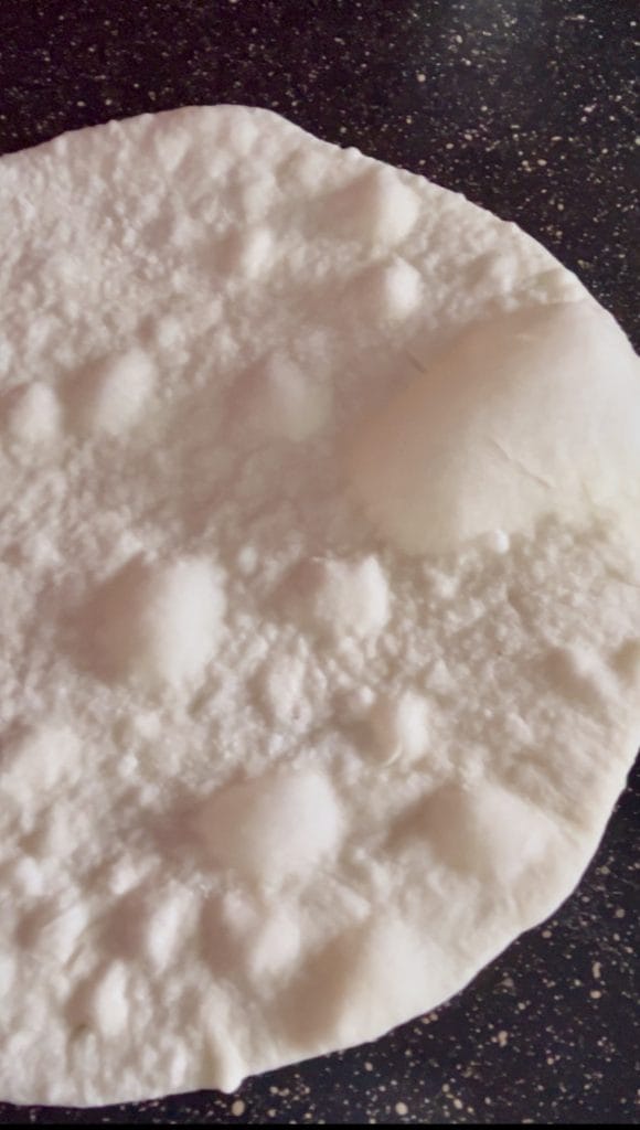 Pendant que nous étalons la première boule, mettons la plaque sur la cuisinière, côté lisse, et faisons-la bien chauffer à feu vif. Lorsqu’elle est bien chaude, baissons légèrement le feu (feu moyen) et cuisons la première piadine. Pendant la cuisson, les bulles classiques commenceront à se former : je vous conseille de percer les plus grosses avec une spatule ou un cure-dent, ainsi la piadine restera bien uniforme.