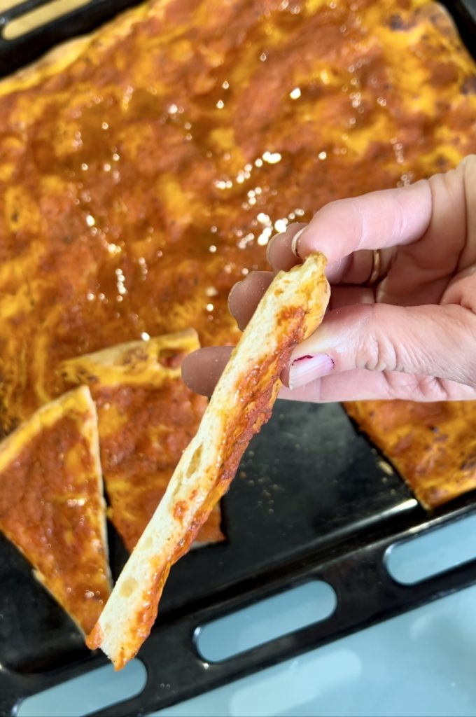 La pizza rouge est parfaite juste sortie du four mais délicieuse même après quelques heures à température ambiante. La pizza rouge ainsi préparée est parfaite pour le goûter, le dîner ou pour enrichir buffets et apéritifs.