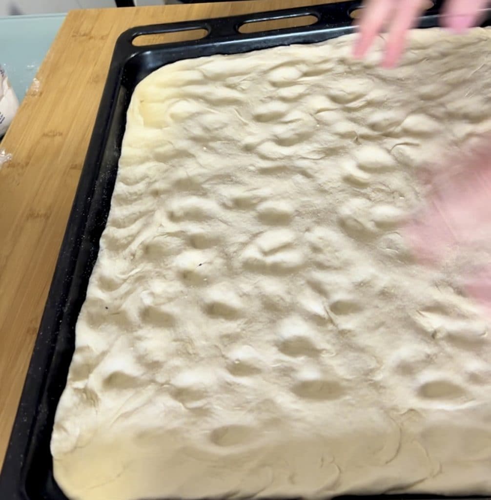 Une fois levée, placez la pâte sur le plan de travail légèrement fariné avec de la semoule et étalez un peu la pâte en appuyant avec les doigts, n’utilisez pas le rouleau à pâtisserie. Transférez la pâte sur la plaque légèrement huilée et continuez à étaler en appuyant avec les bouts des doigts jusqu’à couvrir totalement la plaque. Si vous n’avez pas une grande plaque, divisez la pâte en deux car elle doit être étalée à une épaisseur inférieure à un centimètre même dans les parties les plus hautes. Laissez reposer la pâte dans la plaque pendant au moins 20/30 minutes toujours couverte d’un torchon.
