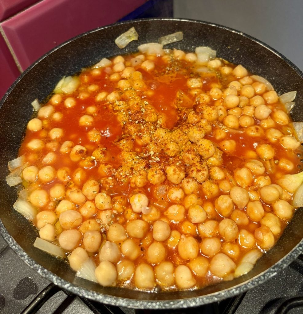 Après les premières minutes, vérifiez la cuisson des pois chiches : la sauce ne doit pas sécher trop. Ajoutez une pincée de curcuma, un peu de paprika (doux ou piquant, selon les goûts), l’origan et ajustez le sel. Mélangez bien pour répartir les épices de manière uniforme, puis laissez cuire encore 5 minutes, toujours à feu vif mais pas trop élevé. Le secret est de garder la sauce onctueuse et savoureuse, ainsi les pois chiches restent succulents et irrésistibles.