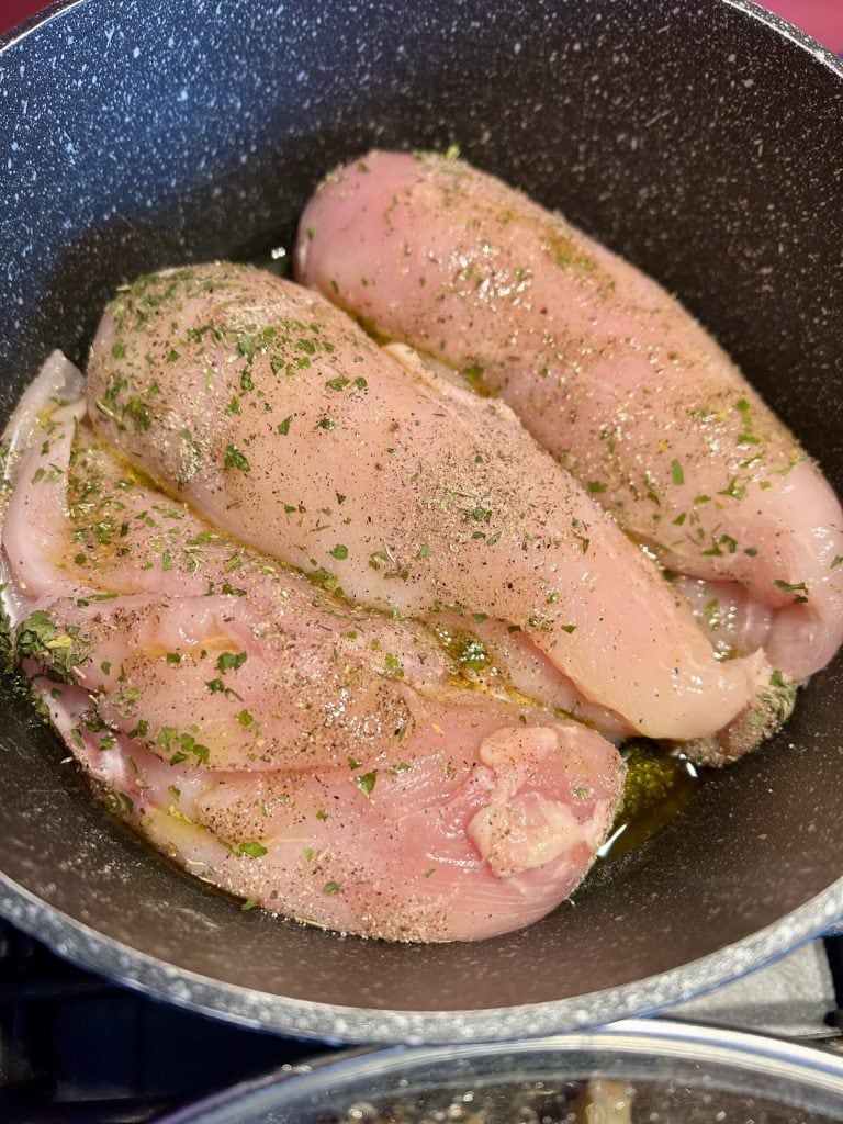 Mettez les trois morceaux de poitrine de poulet entière déjà aromatisée dans la poêle antiadhésive, versez les deux cuillères d’huile, couvrez avec le couvercle et portez sur la plaque de cuisson pour faire dorer la viande.