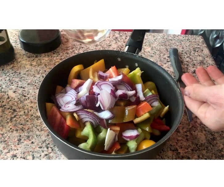 • Laver les poivrons en enlevant toutes les graines. Couper les poivrons dans une poêle antiadhésive, ajouter l’oignon en tranches, le sel, l’huile et 1/2 verre d’eau et mettre sur la cuisinière. Faire revenir à feu vif pendant environ 5′ jusqu’à ce que toute l’eau soit évaporée.