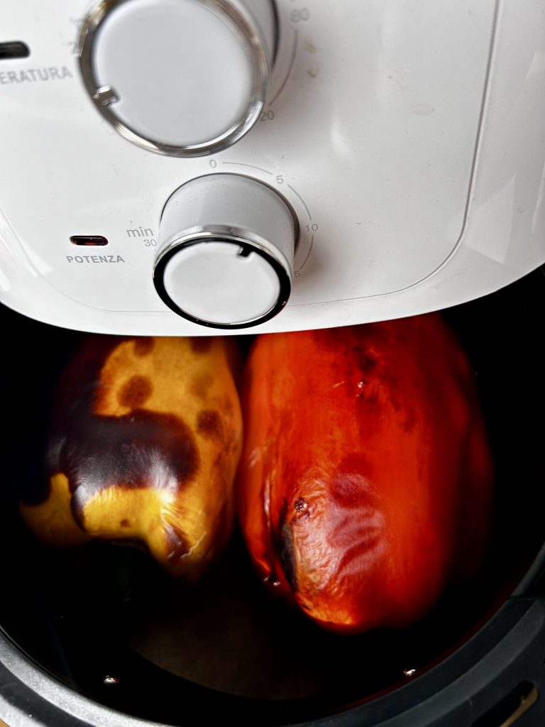 poivrons grillés à la friteuse à air, une excellente alternative à la cuisson au four, ils cuisent uniformément et se pèlent très facilement. En une demi-heure, nous aurons de fantastiques poivrons qui gardent leur structure interne intacte, ce qui permet de les nettoyer facilement de la peau et des graines en excès, devenant ainsi facilement digestibles.