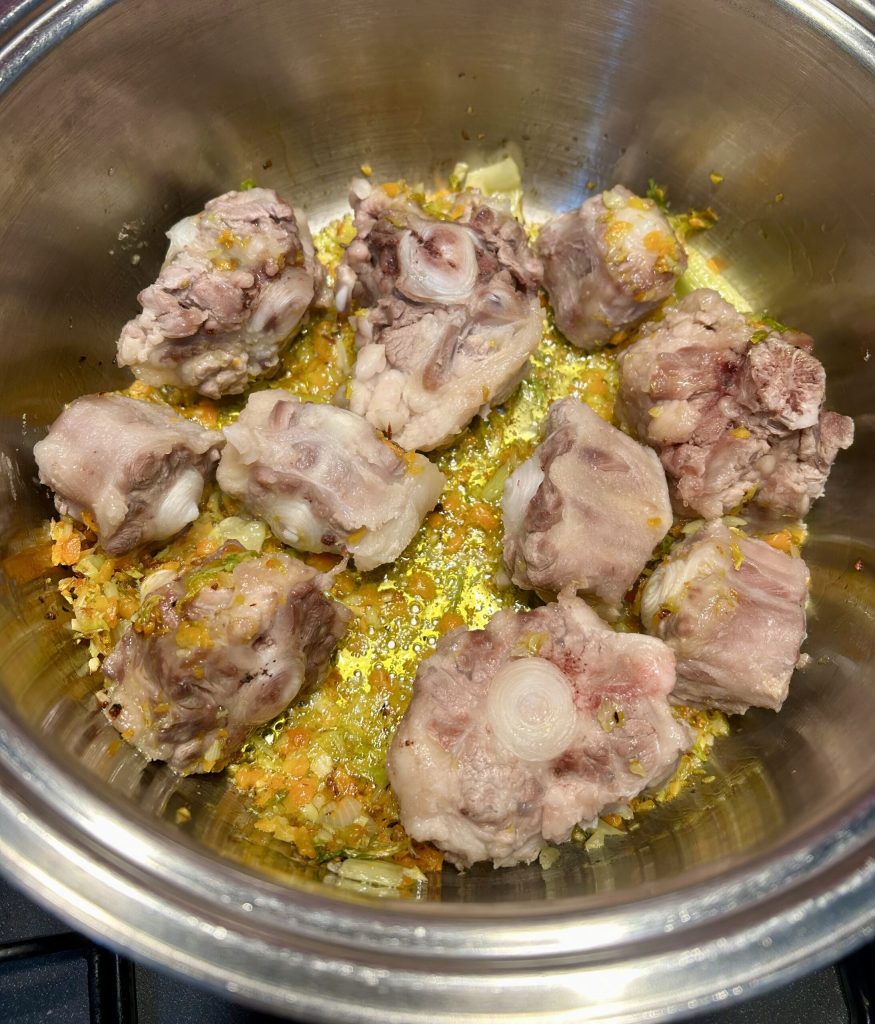Quand le soffritto est bien engagé, j’ajoute dans la casserole les morceaux de queue préalablement blanchis et égouttés.