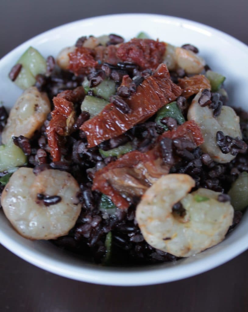 Votre riz vénéré avec courgettes et crevettes est prêt à être dégusté immédiatement, même tiède, ou vous pouvez le conserver au réfrigérateur et le servir froid au besoin. Parfait à emporter au bureau, à la mer ou à préparer à l’avance pour un dîner léger et savoureux.