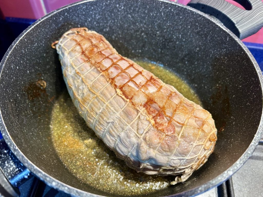 Faites bien dorer toute la circonférence du rôti, en le tournant de temps en temps avec la cuillère, en faisant attention à ne pas casser la viande. Cela permet de garder le rôti juteux à l’intérieur. Lorsqu’il est bien doré de toutes parts, augmentez le feu au maximum et versez le verre de vin. Ajoutez l’ail écrasé et le romarin en morceaux. Laissez légèrement évaporer pendant quelques minutes, puis baissez le feu, couvrez bien avec le couvercle et laissez cuire pendant environ 45 minutes.