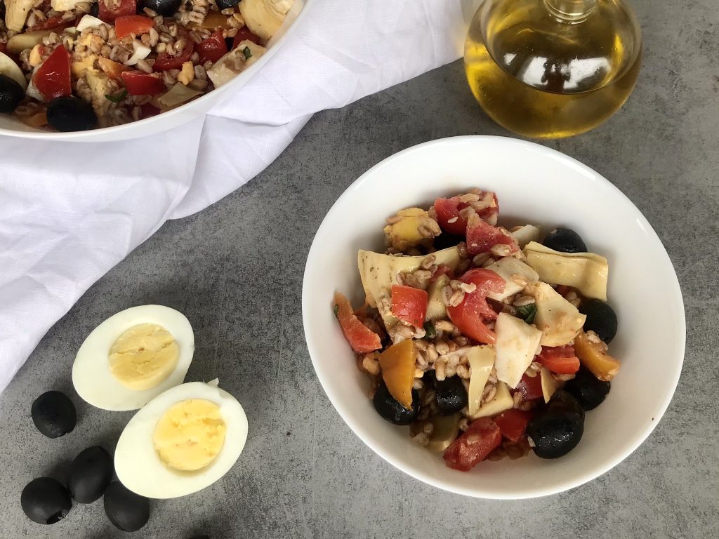Enfin, enrichissez votre salade d’épeautre avec les artichauts coupés, les olives noires, les œufs durs émiettés et les tomates cerises en morceaux.