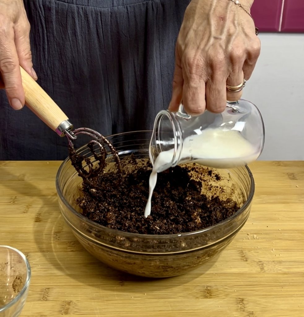 Après avoir haché les biscuits, mettez-les dans un grand bol et ajoutez le sucre, le cacao, le beurre fondu et enfin le lait. Les 30 g de lait suffiront car la pâte doit être molle et humide mais pas liquide ; si toutefois votre pâte était trop compacte, vous pouvez ajouter un peu plus de lait.