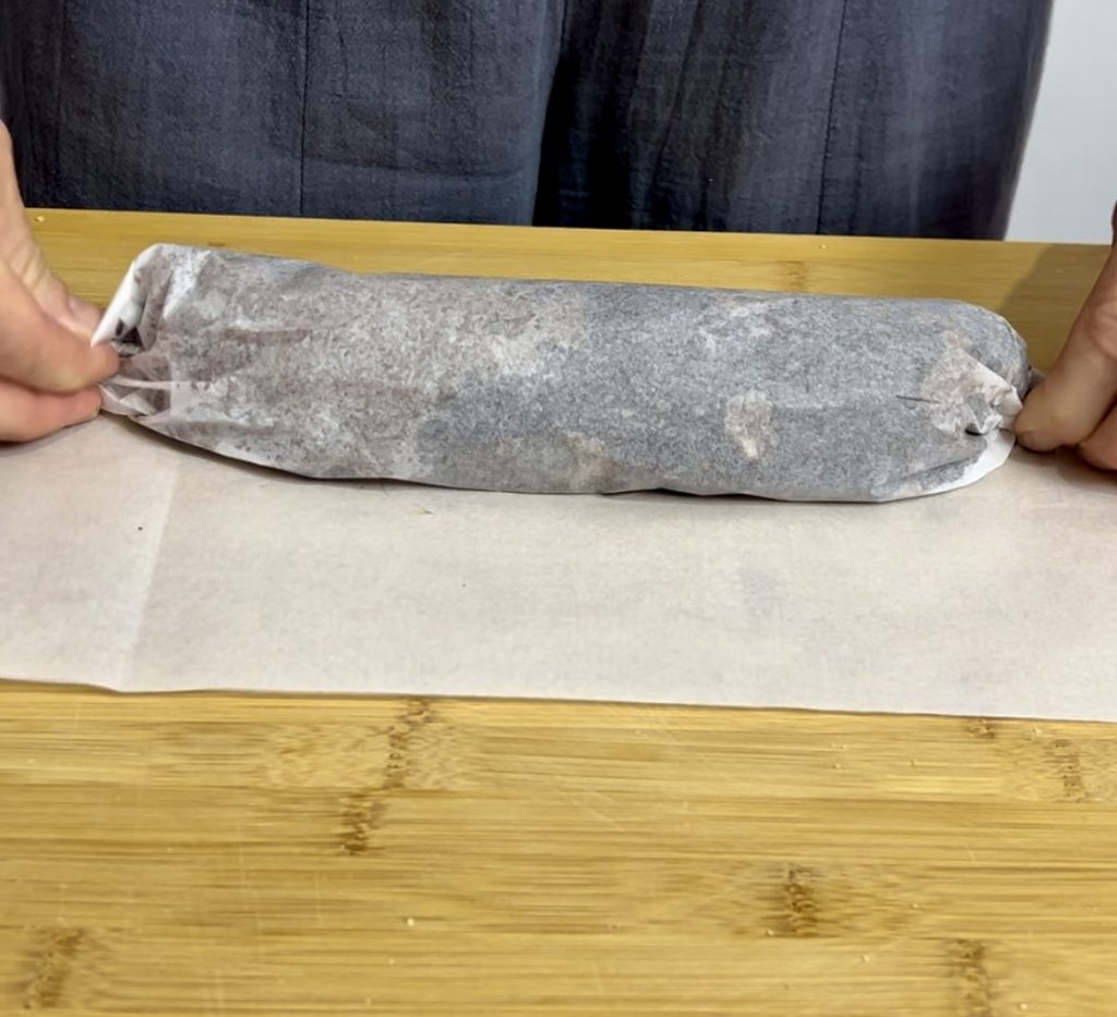Une fois la pâte préparée, placez-la sur un morceau de papier sulfurisé et, à l’aide d’une spatule puis de vos mains, créez le salami en fermant bien les extrémités comme un bonbon pour bien le serrer. Laissez reposer le salami au réfrigérateur pendant quelques heures avant de le consommer.