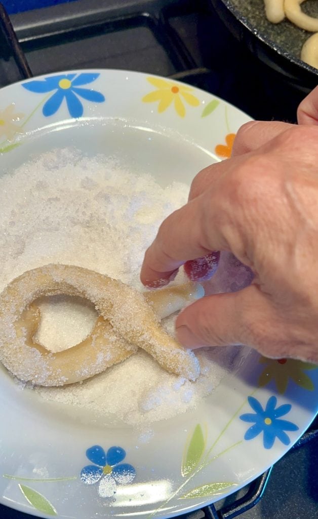• Quand les scoratelli sont dorés des deux côtés, sors-les de l’huile avec une pince de cuisine et passe-les immédiatement dans le sucre en poudre.