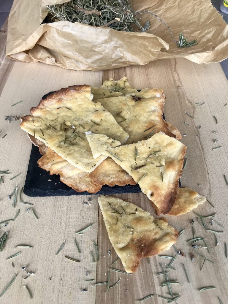 Saupoudrez le plan de travail de farine, mettez-y le levain et avec l’aide du rouleau à pâtisserie, étalez-le en une couche très fine, quelques millimètres. Graissez la plaque de cuisson et déroulez la pâte dessus, graissez-la un peu en surface, ajoutez du sel et du romarin selon votre goût. Enfournez dans un four déjà chaud à 220°C jusqu’à ce qu’elle soit dorée, cela prendra environ 12′ et dégustez.