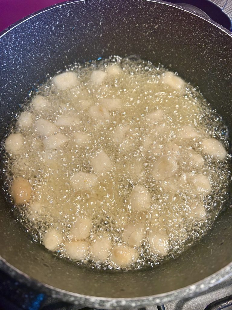 • Lorsque vous commencez à couper les struffoli, il est temps de mettre l’huile pour frire sur le feu. L’huile doit être bien chaude avant de commencer la friture. Pour vérifier sa température, plongez un cure-dent dans l’huile : si des bulles se forment autour, l’huile est prête. Sinon, attendez encore un peu. Faites frire les struffoli peu à peu, pour qu’ils aient de l’espace pour lever et dorer sans trop s’accumuler. Lorsqu’ils sont dorés, sortez-les à l’aide de l’écumoire, en les égouttant bien de l’huile, et poursuivez avec la friture du reste de la pâte.