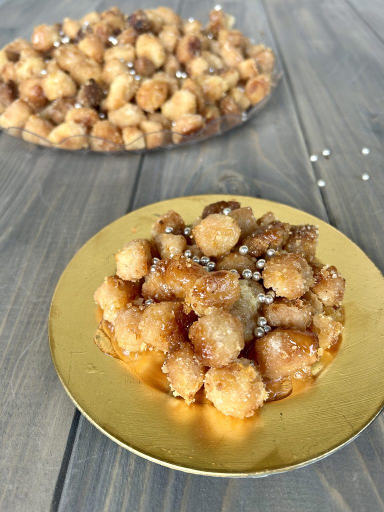 Vos struffoli sont prêts à être servis ! Ils se conservent bien pendant plusieurs jours, s’ils sont bien couverts avec du film plastique. Cependant, ils sont vraiment spectaculaires s’ils sont consommés encore tièdes, donc le choix est le vôtre !