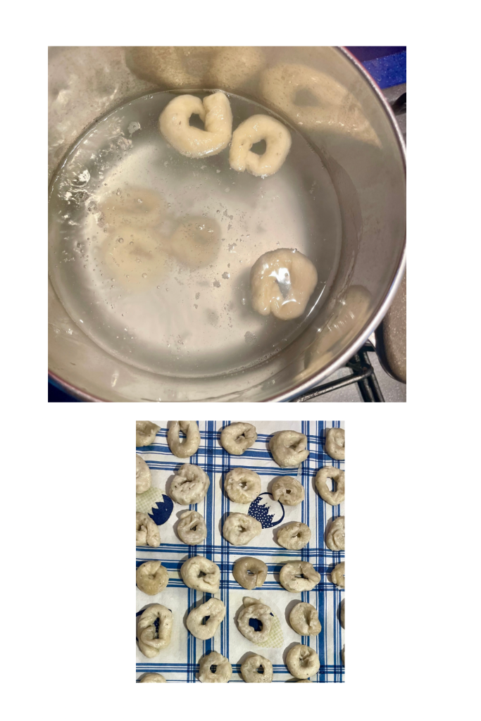 • Lorsque l’eau bout, commencez à cuire vos taralli, peu à la fois. Jetez-les dans l’eau bouillante et laissez-les cuire en les retournant légèrement avec une fourchette jusqu’à ce qu’ils remontent à la surface. Lorsqu’ils remontent à la surface, retirez-les toujours avec la fourchette et placez-les sur une serviette en coton pour les faire sécher.