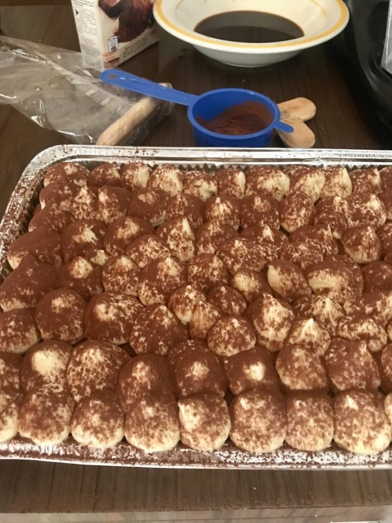 En revenant à la préparation de mon tiramisu, j’utilise les classiques biscuits à la cuillère, imbibés de café froid et amer, recouverts de crème au mascarpone sans ajout de crème et uniquement saupoudrés de cacao amer sur la couche finale.