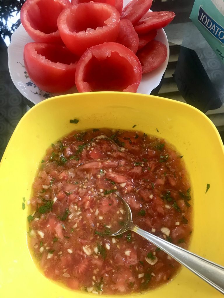 Émincer avec les ciseaux toute la pulpe des tomates et l’assaisonner avec du sel, du poivre, de l’huile, de l’ail en très petits morceaux et du persil haché. Ajouter le riz et mélanger, laisser ce mélange couvert reposer au moins une demi-heure mais pas plus d’une heure.
