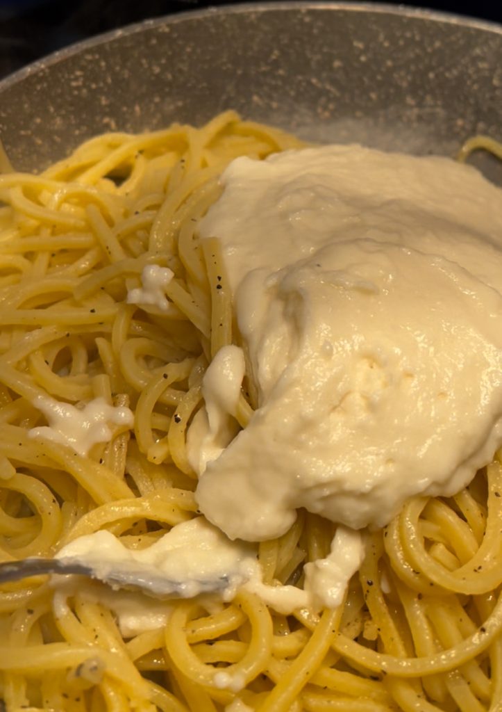Le secret d’une Cacio e Pepe vraiment crémeuse réside dans la température : la crème de pecorino doit être préparée au dernier moment, lorsque les pâtes sont cuites, pour éviter un choc thermique qui pourrait la faire cailler. Une autre étape fondamentale est de faire sauter les tonnarelli avec le poivre à feu allumé, en ajoutant un peu d’eau de cuisson pour créer la base de la sauce. Ce n’est qu’après avoir éteint le feu que la crème est incorporée, qui grâce à la chaleur de la poêle fondra parfaitement, enrobant les pâtes d’un liant lisse et velouté. Un geste simple, mais décisif pour mettre sur table une Cacio e Pepe digne des vrais Romains.