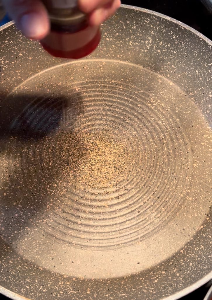 Pendant que l’eau chauffe, faites chauffer une poêle antiadhésive et versez une bonne quantité de poivre noir moulu. Laissez-le griller pendant quelques secondes, jusqu’à ce qu’il libère tout son parfum.