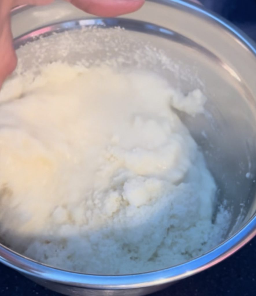 (Le secret est d’utiliser de l’eau chaude mais non bouillante, pour éviter que le fromage ne s’agglomère.)