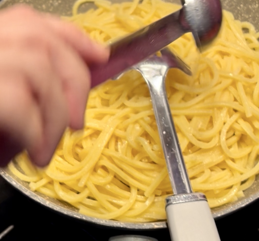 Rallumez la flamme sous la poêle et faites sauter les pâtes en ajoutant quelques louches d’eau de cuisson : cela servira à créer la base de la crème. Éteignez la flamme sous la poêle.