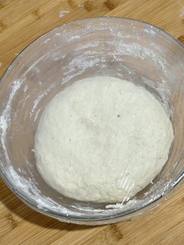 Pour terminer de bien pétrir, j’ai transféré la pâte sur le plan de travail légèrement fariné, j’ai tourné plusieurs fois la pâte puis j’ai formé une boule et je l’ai remise dans le bol en verre. J’ai couvert la pâte avec un film plastique et j’ai laissé lever pendant environ deux heures, jusqu’au doublement.