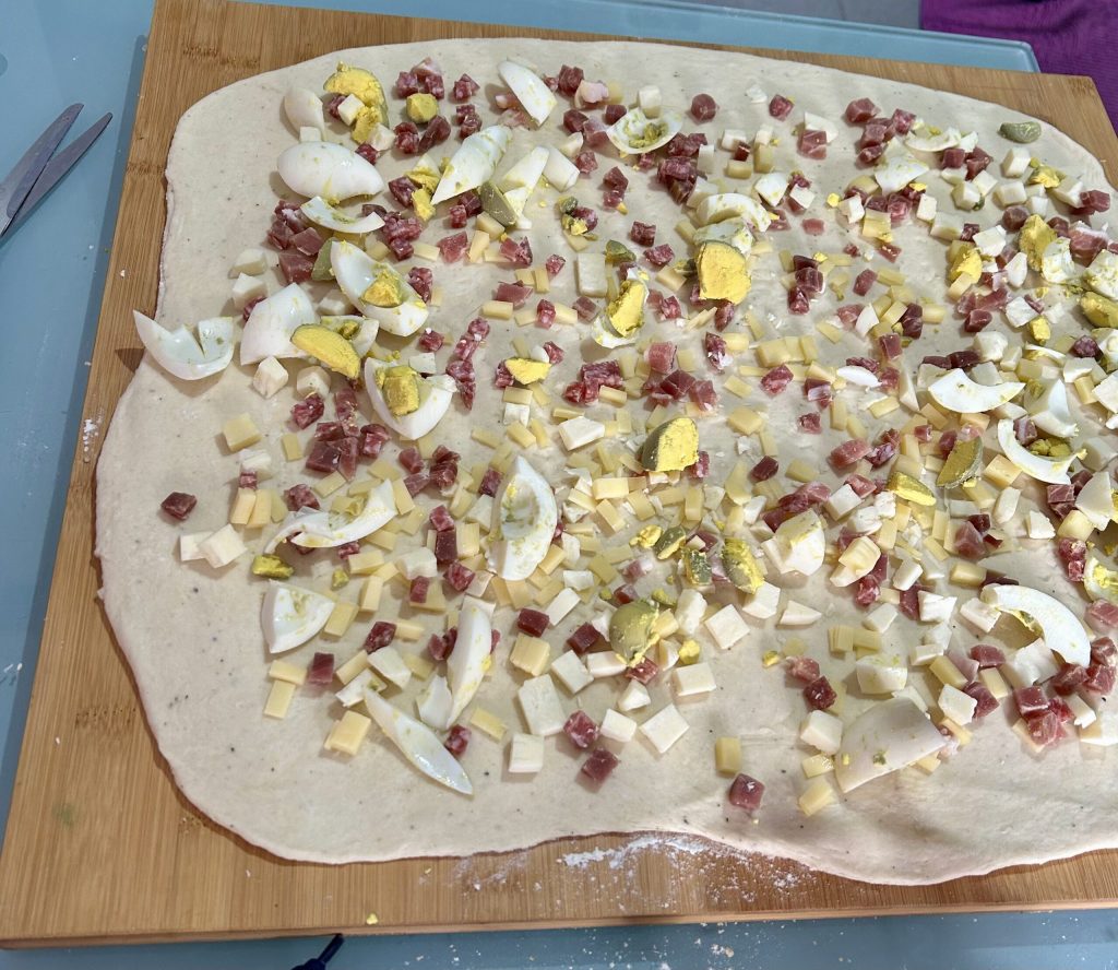 Pendant que la pâte lève, préparez tous les ingrédients de la garniture en petits morceaux, y compris les œufs durs. Lorsque la pâte a levé, transférez-la sur le plan de travail légèrement fariné et étalez-la en un grand rectangle de 3/4 mm d’épaisseur.