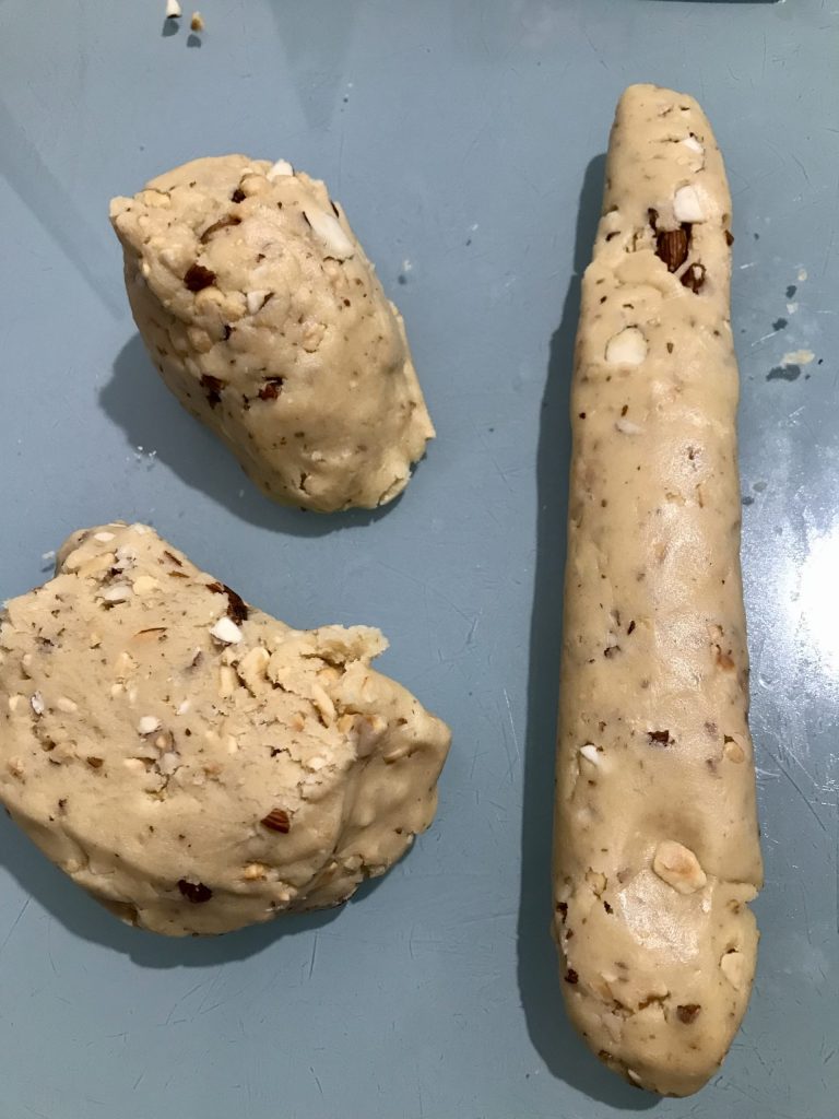 • Compacter la pâte des tozzetti avec les mains et la déposer sur un plan de travail. Pas besoin de fariner le plan. Diviser la pâte en trois pour créer trois pains.