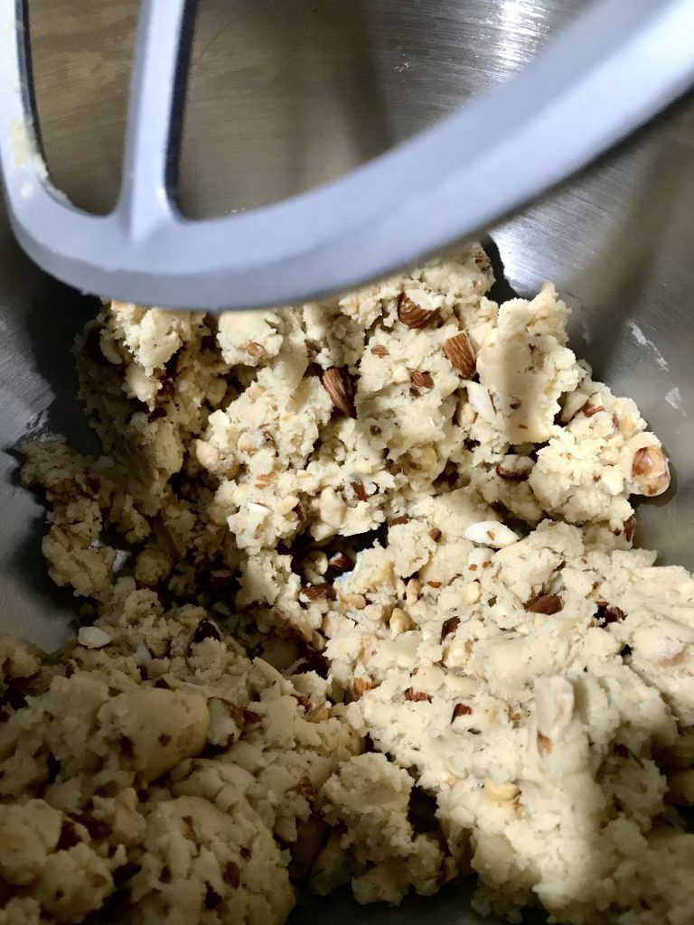 • Concasser grossièrement les noisettes grillées et insérer dans le pétrin, avec le crochet feuille, tous les ingrédients des tozzetti dans l’ordre indiqué.