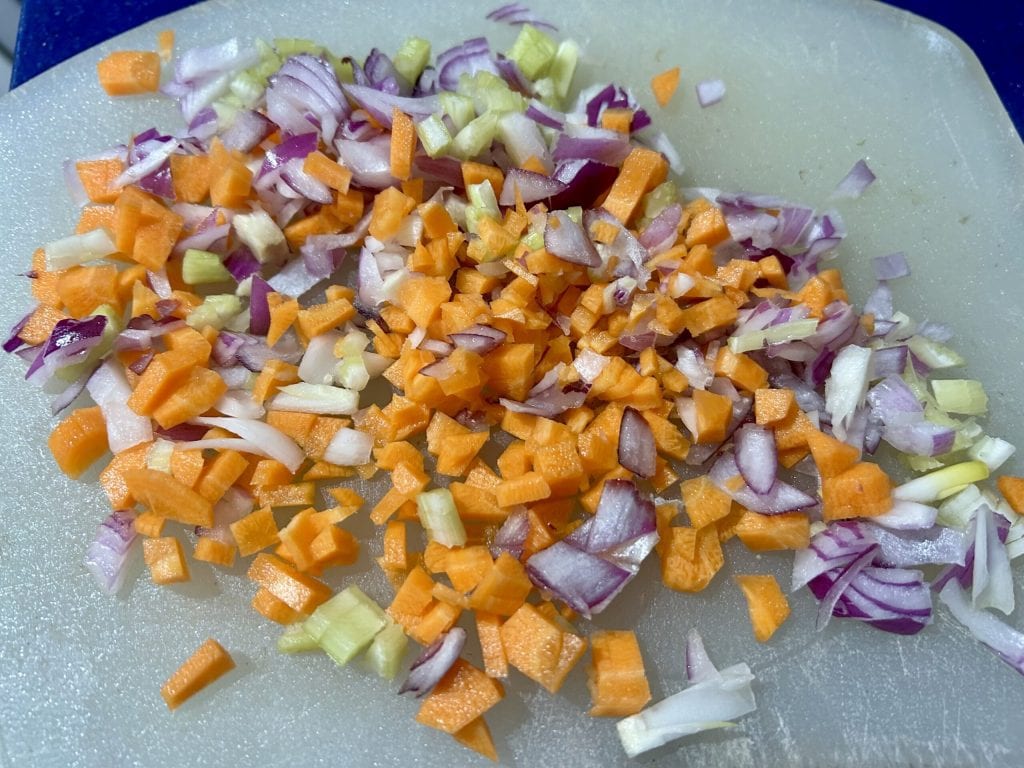 Nettoyez et épluchez la carotte, le céleri et l’oignon. Coupez-les en petits morceaux en utilisant un couteau tranchant et une planche à découper. Mettez les ingrédients hachés dans une casserole, ajoutez une cuillère d’huile et le piment, puis faites revenir à feu moyen, en veillant à bien les dorer sans les brûler.