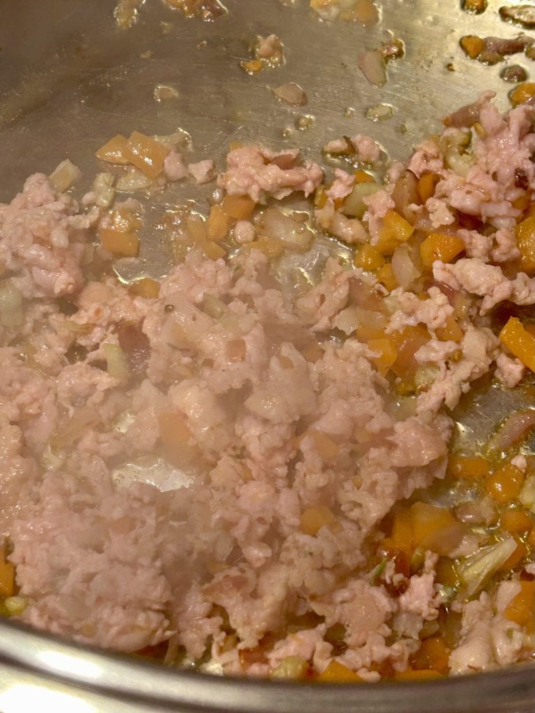 Lorsque le soffritto est bien doré, ajoutez les deux saucisses sans la peau et émiettées. Avec l’aide d’une louche ou d’une fourchette, émiettez les saucisses autant que possible et laissez-les cuire pendant quelques minutes.