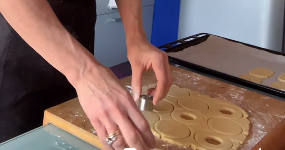 Après avoir découpé tous les grands disques, disposez-les délicatement sur des plaques de cuisson recouvertes de papier sulfurisé. Il en faudra au moins deux pour bien répartir tous les biscuits. À ce stade, prenez la moitié des disques et, avec un emporte-pièce plus petit, créez un trou au centre pour obtenir la forme classique des yeux de bœuf. Quand tous les biscuits sont prêts, enfournez dans un four déjà chaud à 180° pendant environ 12 minutes. Les biscuits doivent être juste dorés : vérifiez que le fond soit cuit, mais sans trop les faire brunir en surface.