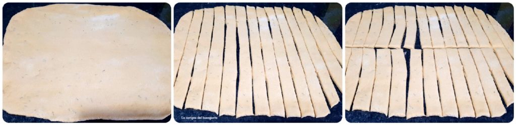 • Une fois levée, transférer la pâte sur un plan fariné et étaler la pâte en réalisant une abaisse pas trop fine, puis couper des bandes dans le sens de la longueur d’environ un doigt et ½, puis les couper en deux dans le sens de la largeur.