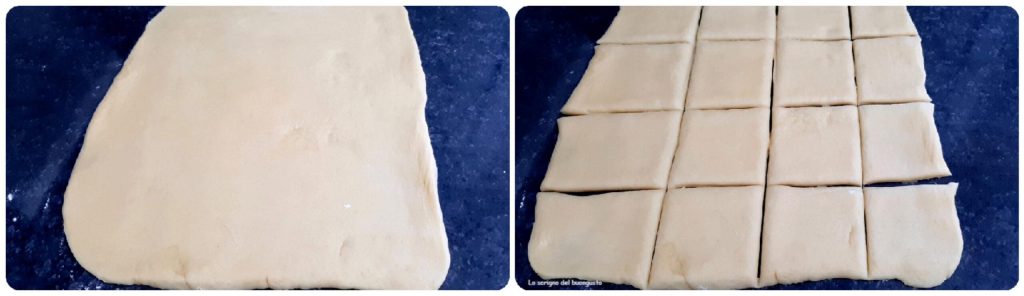 • Une fois levée, transférer la pâte sur un plan de travail légèrement fariné, l’étaler avec un rouleau à pâtisserie pour obtenir un rectangle assez épais, découper des carrés, ou rectangles, ou losanges, couvrir avec un torchon et laisser lever encore une demi-heure.