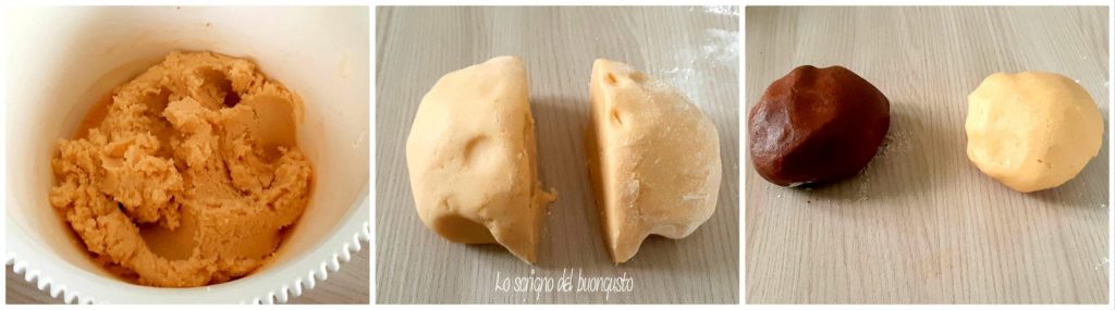 La pâte obtenue sera très molle et à ce stade, la verser sur un plan de travail, former une boule et la diviser en deux, dans l’une ajouter le cacao amer et reformer une boule, dans l’autre ajouter un peu de farine pour obtenir la bonne consistance.