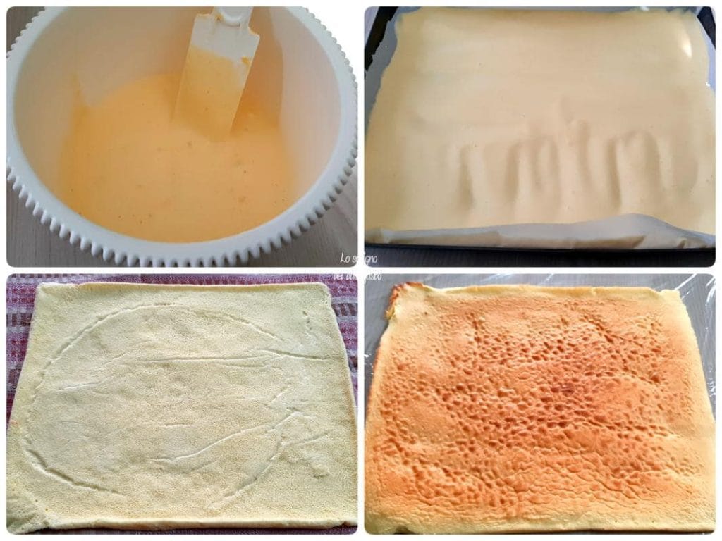 Une fois cuite, retirez la pâte biscuit du four et retournez-la sur un torchon et retirez lentement le papier sulfurisé, laissez tiédir quelques minutes, puis étalez dessus une feuille de film alimentaire et retournez-la de manière à ce que la pâte biscuit reste avec le film sur le plan de travail.