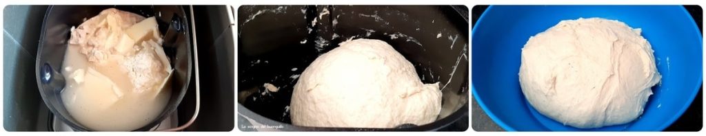 • Prenez le bac de la machine à pain, insérez la lame pétrisseuse, ajoutez d’abord les ingrédients secs, puis les liquides, mettez le bac dans la machine à pain, lancez le programme pâte, dans ma machine c’est le programme 17 et il dure 45 minutes.