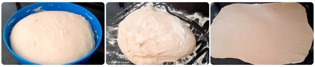 • Une fois levée, transférez la pâte sur un plan de travail, étalez une feuille rectangulaire…..