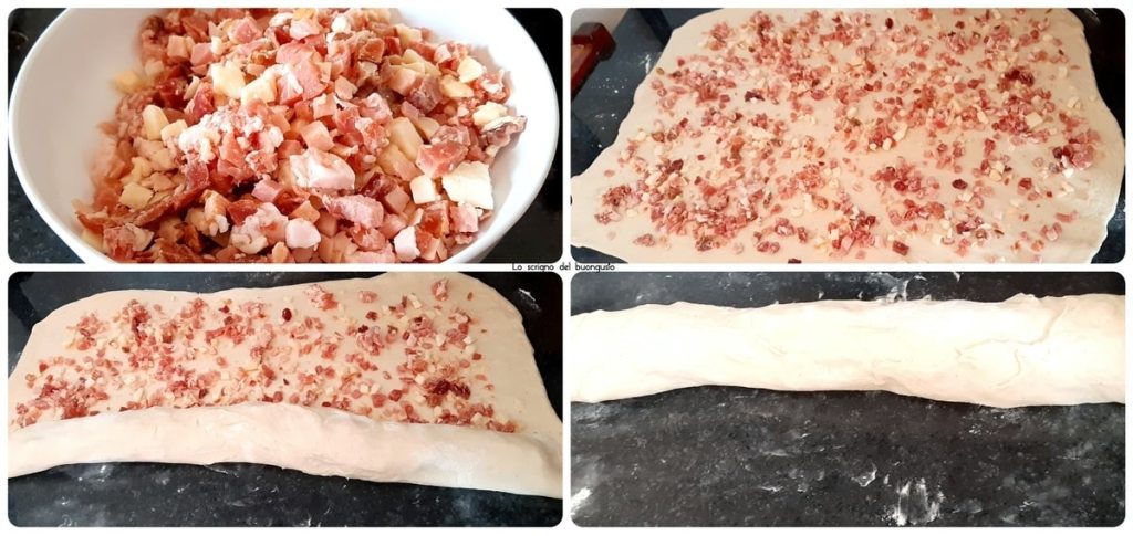 Dans la recette que j’ai faite, j’ai respecté la tradition de placer les œufs de manière à ce qu’ils soient visibles et je l’ai réalisé en étalant la pâte levée et en ajoutant les charcuteries et fromages pour ensuite rouler le tout avec la pâte.