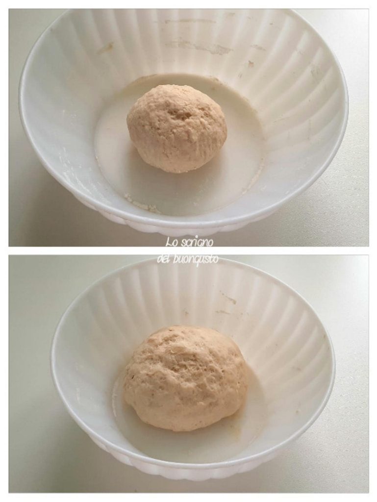 Tout d’abord, préparez la biga en mettant dans un bol la levure de bière fraîche dissoute dans l’eau tiède et 70 g de farine en mélangeant bien jusqu’à obtenir une boule homogène.