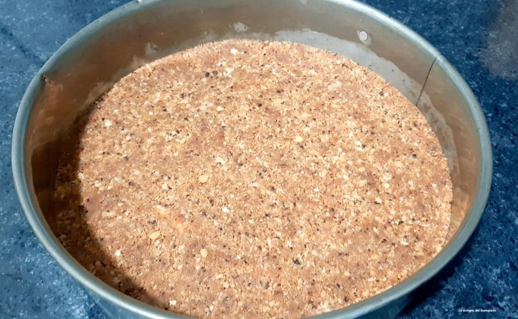• Tout d’abord, prendre les biscuits secs, les mixer avec le beurre légèrement ramolli, puis prendre un moule à charnière de 24 cm de diamètre et au fond mettre du papier sulfurisé, verser les biscuits et avec une spatule couvrir tout le fond, ensuite aider avec le dos de la cuillère pour bien presser, en ajustant bien la base aussi sur les bords.