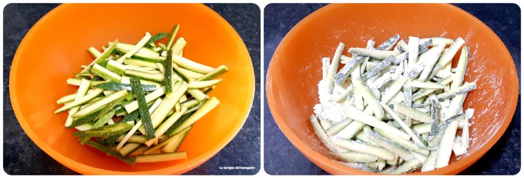 Les passer dans la farine en les enrobant bien, pendant ce temps chauffer l’huile pour la friture et au moment de la cuisson, tamiser les courgettes dans une passoire pour enlever l’excès de farine.