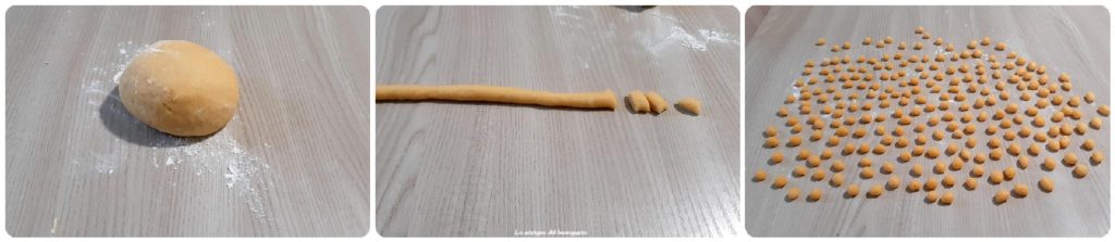 Une fois tous les ingrédients réunis, transférez sur un plan de travail et créez une boule, d’où vous tirerez tous les cordons pour obtenir de petits gnocchis et réaliser de petites boules comme des pois chiches, ou à partir de la boule de pâte, prenez de petites pincées de pâte et formez les boules.
