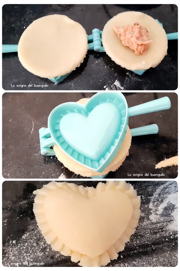 • À partir des cercles obtenus, découpez des cœurs avec des emporte-pièces individuels, garnissez-les avec une cuillère à café de préparation en les scellant, ou utilisez-en un comme le mien qui s’accouple et ferme le tout.
