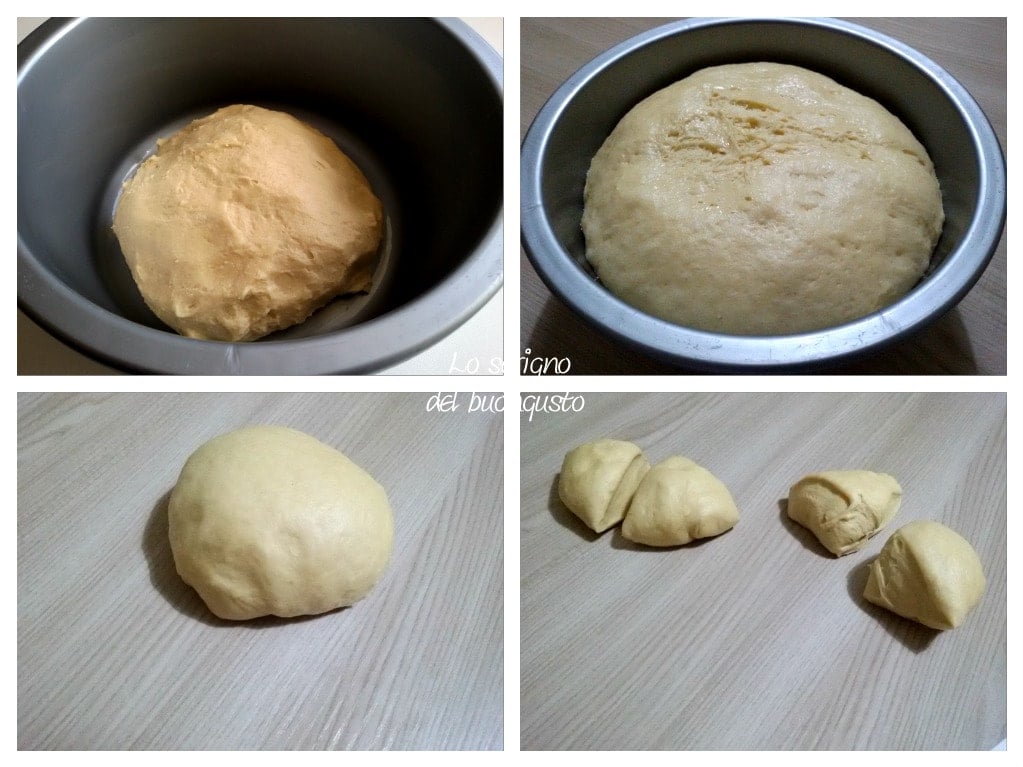 Mettre dans un bol couvert d’un film plastique et laisser lever dans le four avec la lumière allumée pendant au moins 3 heures et en tout cas jusqu’au doublement.