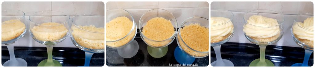 • Enfin, émietter un peu de génoise restante, y ajouter un peu de colorant jaune en mélangeant bien (il doit rester des miettes) et saupoudrer sur les coupes pour créer l’effet mimosa.