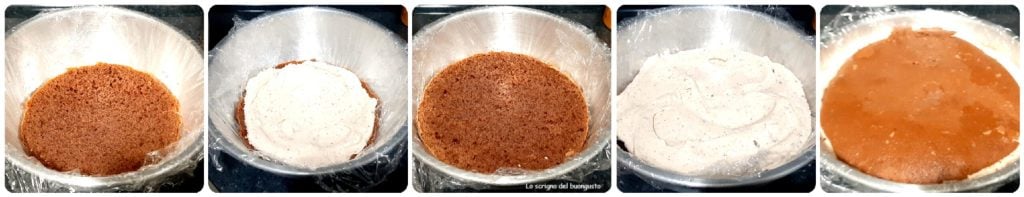Couper 5 disques de pâte fins en en réservant un (moins de ½ cm pour nous ajuster) de la génoise au cacao préparée précédemment, le mettre sur la base à l’intérieur du dôme, l’arroser avec le mélange de rhum et d’eau.