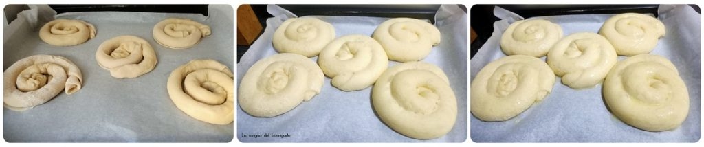 Placer les spirales obtenues sur une plaque de cuisson recouverte de papier sulfurisé, bien espacées, et laisser lever jusqu’à ce qu’elles doublent de volume.