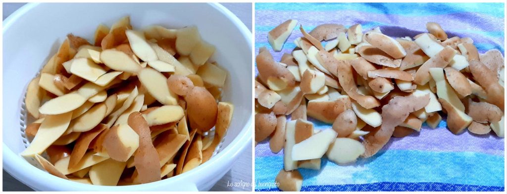 Les épluchures, comme dans ce cas, ont été épluchées au couteau donc elles ne sont pas très fines et faites exprès un peu plus épaisses, mais si vous les épluchez avec un économe, en plus d’être plus fines, elles cuiront beaucoup plus rapidement.