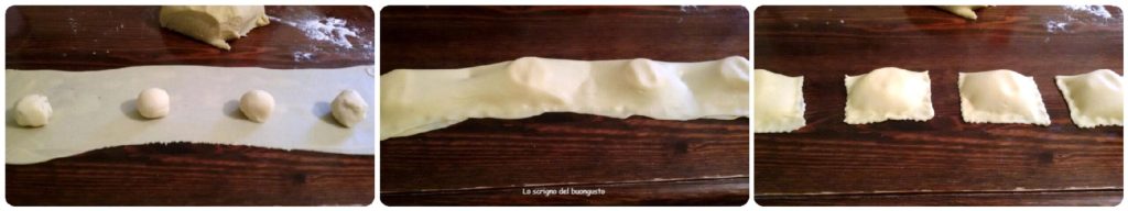 Découpez des feuilles, disposez un peu de farce en les espaçant, puis repliez pour former des demi-lunes ou des carrés selon votre préférence et soudez bien les bords.