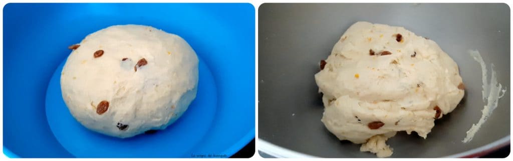 Enfin, ajouter les raisins secs égouttés, les fruits confits et terminer la pâte.